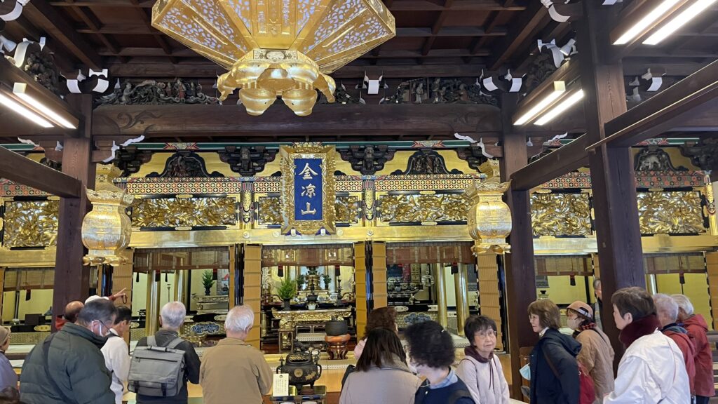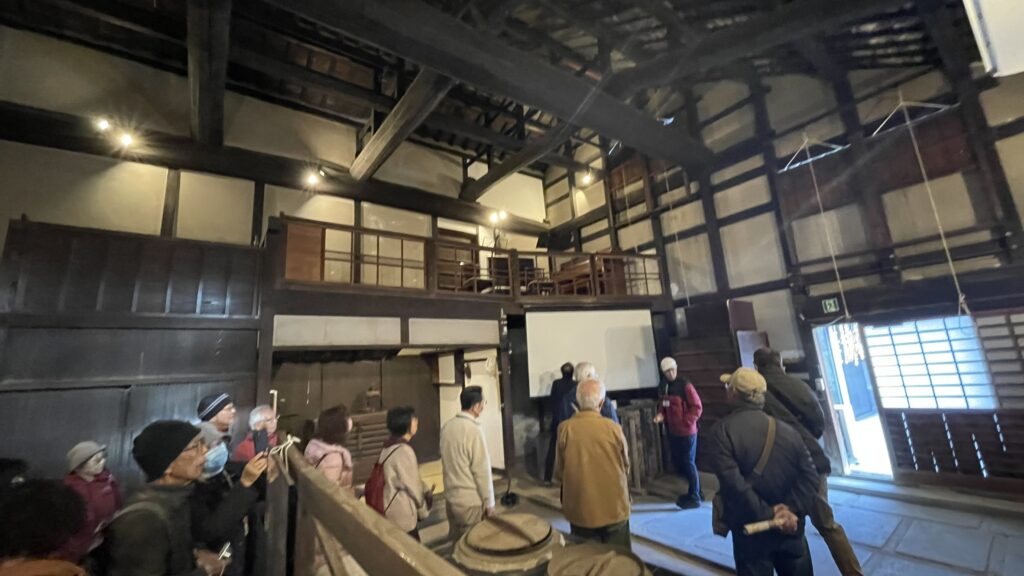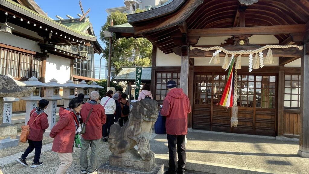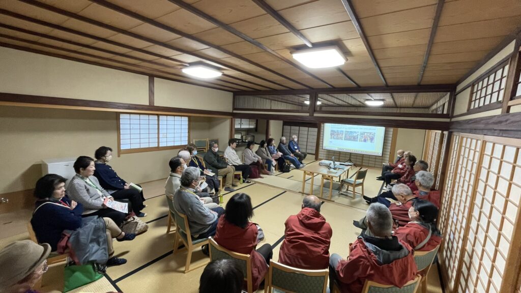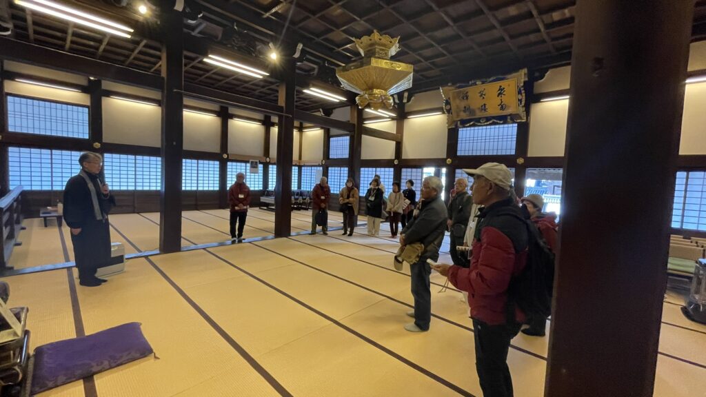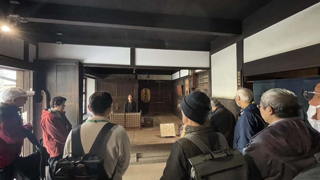 岸和田ボランティアガイドと交流会報告 お知らせ 2025.12.18 2025年12月16日(火) 午後から岸和田ボランティアガイド14名のみなさんを寺内町に案内し、そのあと情報交換して親交を深めました。願泉寺では本堂の中で特別にご住職に願泉寺の成り立ちや彫り物について説明を受け、また廻船問屋であった廣海住宅ではご当主から江戸時代のままの建物内部をご案内して頂きました。寺内町を一通り巡ったあと、感田神社参集殿で情報交換会を行いました。今後とも岸和田ボランティアガイドさんとは、親しく交流を続けていきたいと思っています。