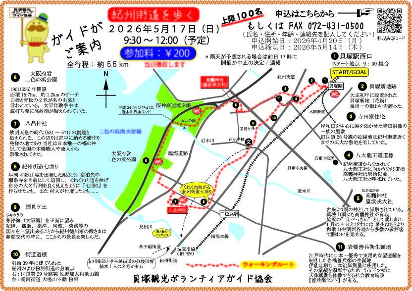 紀州街道を歩こう ガイドが案内します イベント告知 2026.04.01 5月17日(日)当ガイド協会主催で行います。南海貝塚駅から脇浜戎大社を経て二色の浜公園に向かいます。帰りは八品神社から紀州街道に入り貝塚駅に戻ります。途中あちこち名所など案内しながら歩く2時間半5.5Kmのコースです。よくご存じの道でもガイドと歩くと再発見があるかもしれません。お申込みお待ちしています。 日時 5月17日(日)9時30分南海貝塚駅西口集合 参加費 200円 申込方法 下記のQRコード または FAX072-431-0500 まで 申し込みは4月20日から